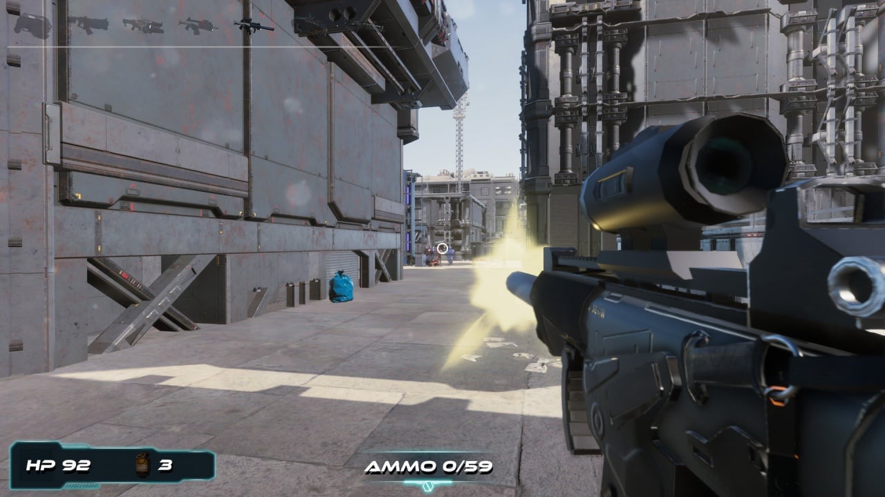 Интерфейс игры прост и функционален, не отвлекает от процесса. В левом нижнем углу видны здоровье и количество гранат, а в верхней части – текущее оружие из инвентаря. Счетчик патронов постоянно напоминает о необходимости собирать боеприпасы с поверженных врагов. На локациях скрыты тайники с новыми видами вооружения и аптечками. Исследование этих укрытий увеличивает шансы на выживание в этом опасном городе.
