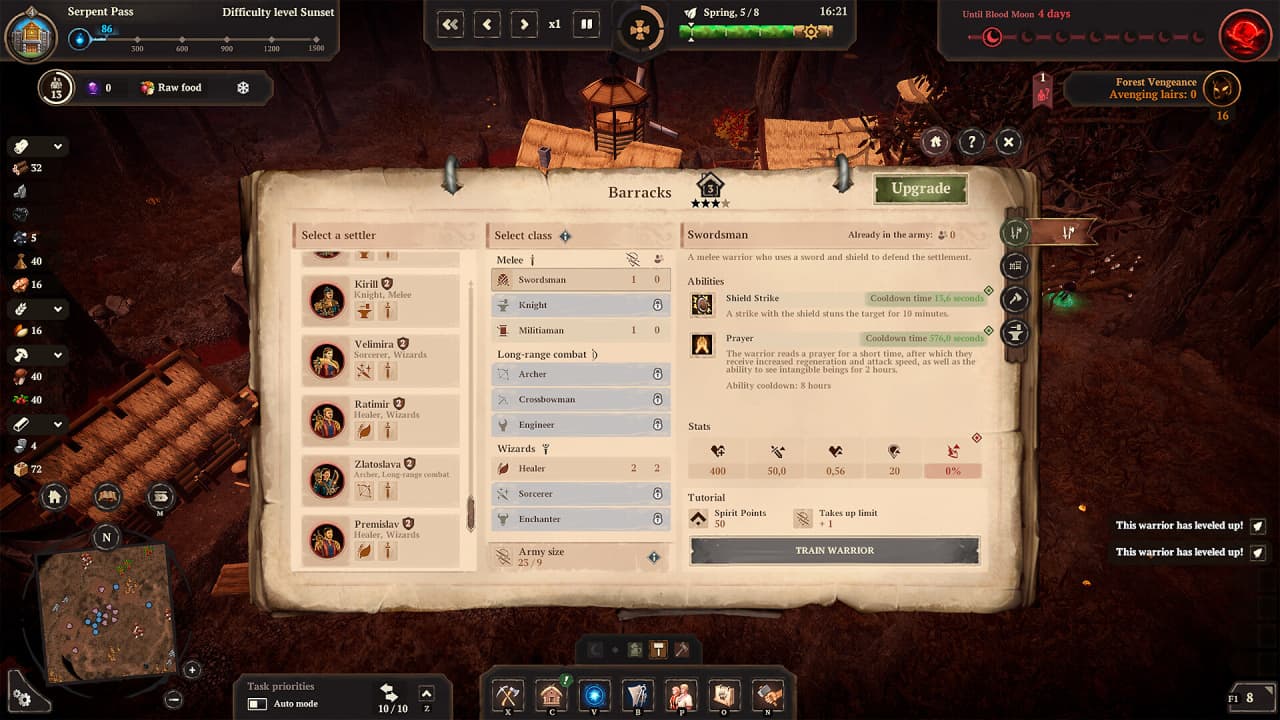 Каждый персонаж обладает уникальными характеристиками, потребностями и способностями, что придаёт им индивидуальность. Чтобы лагерь функционировал, геймеру нужно обеспечить комфортные условия и организовать поставки ресурсов, таких как древесина и еда. Цикл смены времён года, а также день и ночь оказывают значительное влияние на игровой процесс. С приходом зимы армии врагов становятся всё сильнее, представляя серьёзную угрозу для мирных жителей.