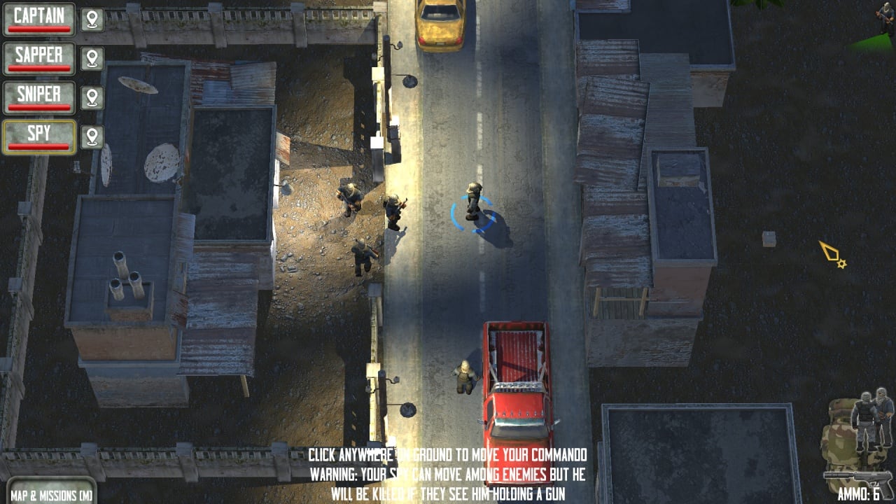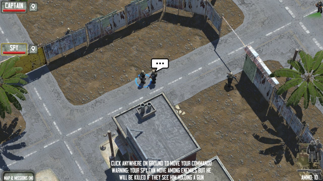 Взаимодействуйте с окружающей средой, используя её как укрытия для своих воинов. За развалинами, взорванными автомобилями или зданиями прячутся ваши юниты, оставаясь незаметными. Во время обстрелов они используют объекты как защиту. Чтобы одержать победу, изучайте движения оппонента, которые часто меняются на уровнях. Увеличивайте и уменьшайте масштаб изображения, вращайте камеру, чтобы отдавать приказы или искать оптимальные позиции. Если рядом с постройками что-то взрывается, они могут загореться, а огонь распространиться на соседние объекты.