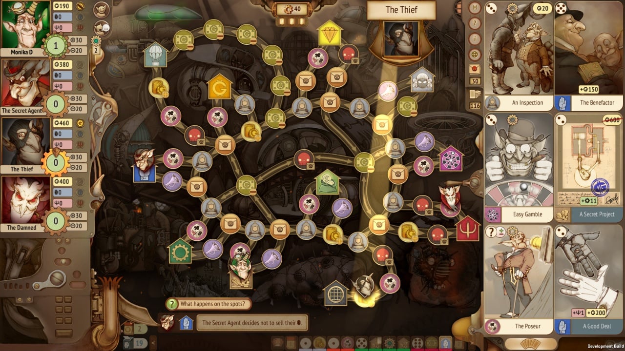 Gremlins, Inc. — это пошаговая стратегия с элементами карточной игры, выполненная в формате настольного проекта. Игра предназначена для 2-6 участников, предлагая возможность сразиться с ИИ или в сетевом режиме. Во время партии пользователи перемещают свои фишки по игровому полю, состоящему из центрального круга и 10 отводов. Хотя возможны перемещения через круг, основное движение происходит против часовой стрелки.