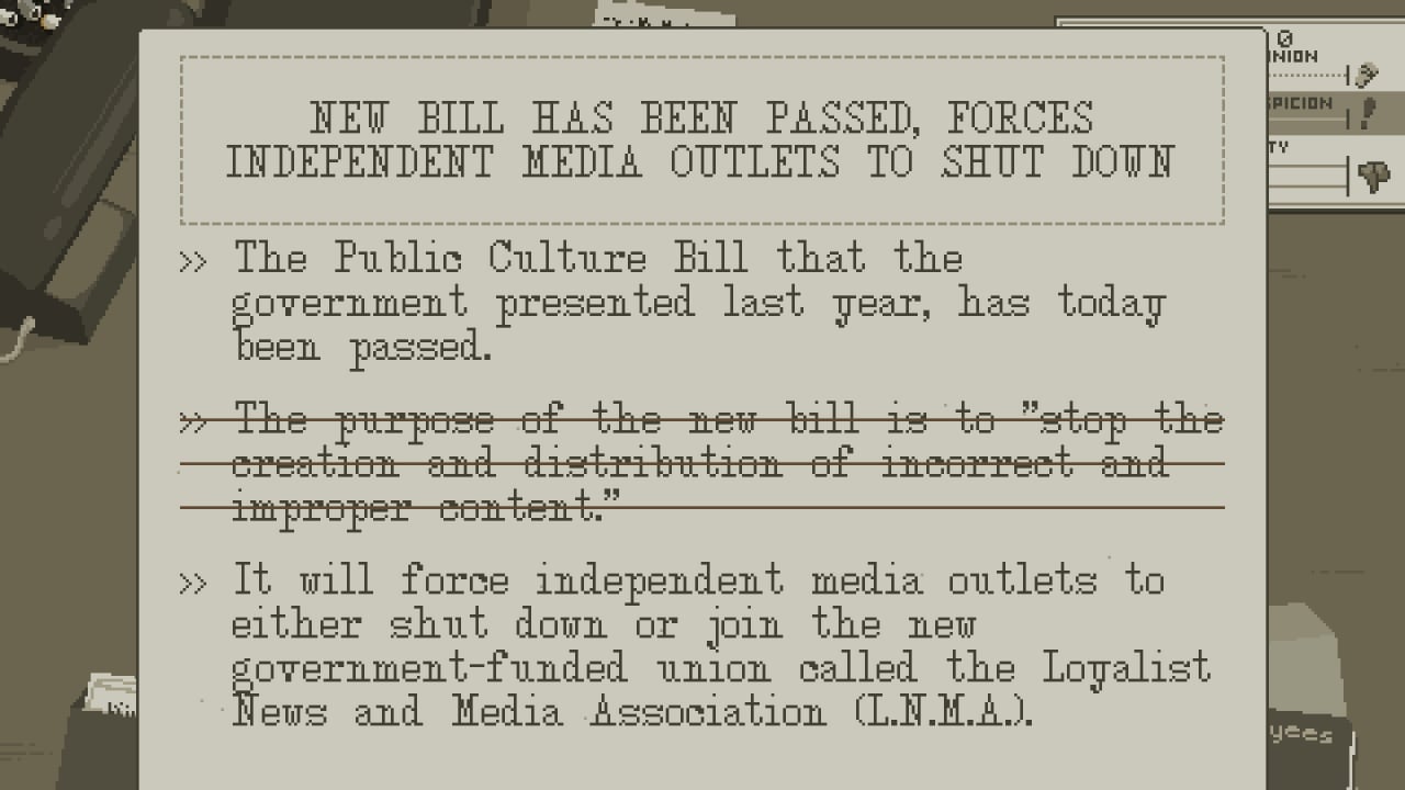 Лоялисты, пришедшие к власти после выборов, стремятся контролировать информацию. Геймеру предстоит подобрать слова так, чтобы не вызвать гнев правительства, редактируя тексты журналистов, которые порой могут быть недовольны изменениями. Каждое решение имеет последствия: какие статьи увидят свет, а какие окажутся под запретом. Темы варьируются от здравоохранения до мятежей, отражая остроту текущих событий.