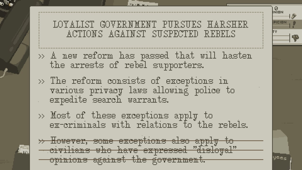 Редактируя и удаляя спорные моменты, пользователь влияет на общественное мнение о власти и оппозиции. В этом симуляторе редактора геймер балансирует между требованиями коллег-журналистов, настойчивыми повстанцами и жесткой позицией Лоялистов. Угодить всем непросто, и каждый шаг может обернуться конфликтом. В процессе редакции геймер получает письма от недовольных общественных деятелей и лидеров мятежников, что добавляет напряженности в динамику игры.