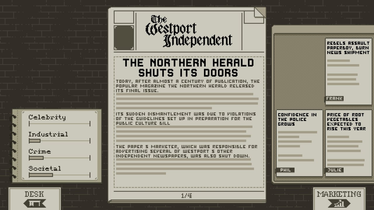 В The Westport Independent геймер становится редактором в послевоенном государстве, где цензура и правда переплетаются в жестокой борьбе. Пользователь сталкивается с необходимостью различать истину и манипуляции, принимая решения о публикации статей в условиях политической нестабильности. Журналистика здесь — не просто профессия, а инструмент власти.