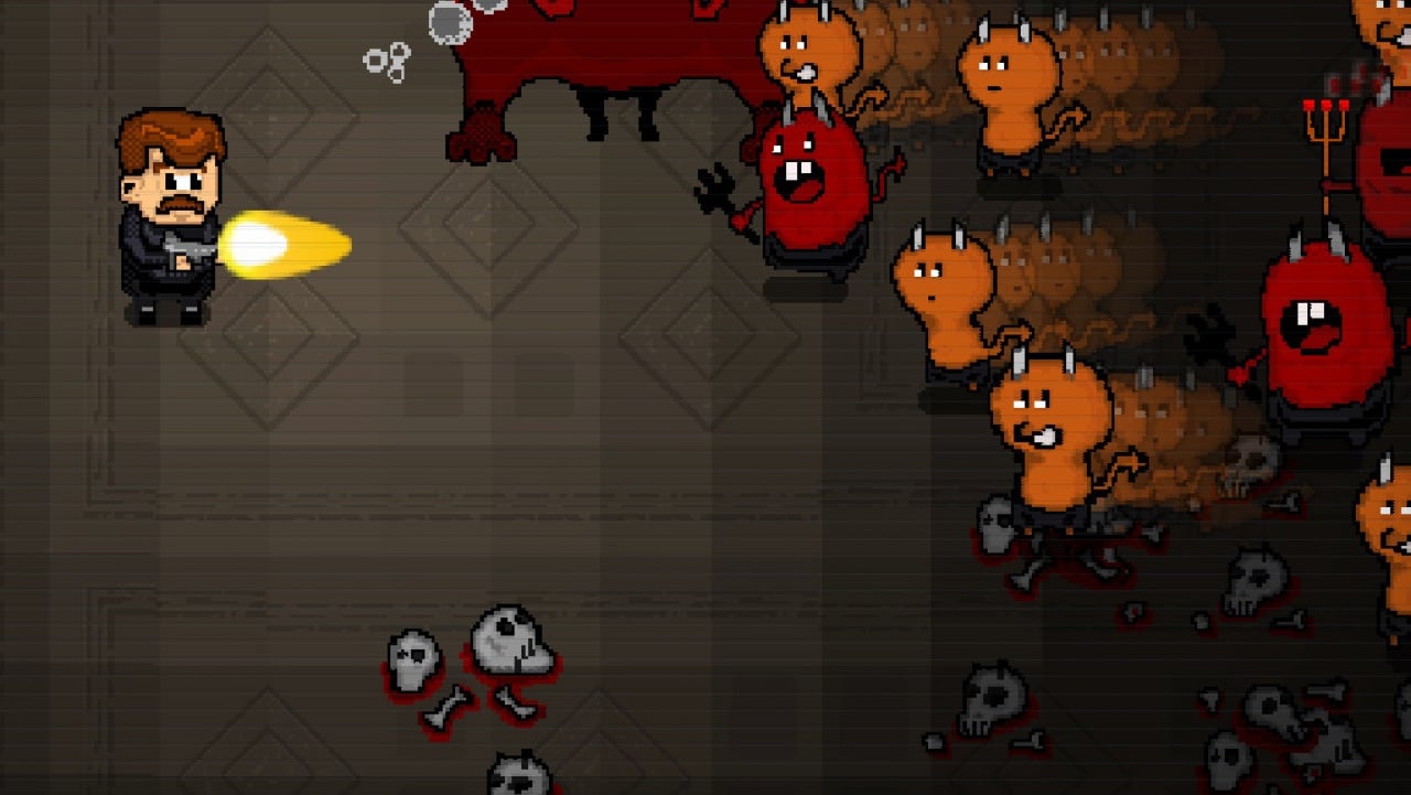 Уровни в Mustache in Hell полны ловушек. Циркулярные пилы, шипы и другие опасные объекты наносят урон только главному герою, в то время как враги безнаказанно проходят мимо. Усатый коп способен не только передвигаться, но и делать рывки, хотя в этот момент не становится неуязвимым.