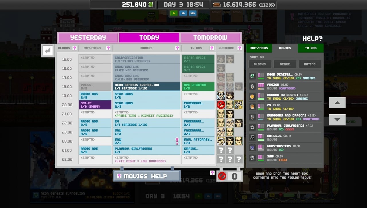Необходимо подстраиваться под требования зрителей, рекламодателей и артистов. Последние могут плохо справляться с ролями, если не контролировать их уровень счастья. Реклама бывает как для широкой аудитории, так и нишевая. Важно правильно заполнять блоки и выполнять задачи в срок. В противном случае рекламные агентства потребуют уплаты штрафов.