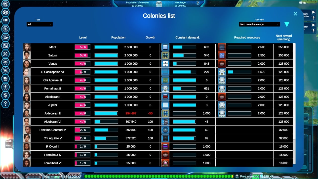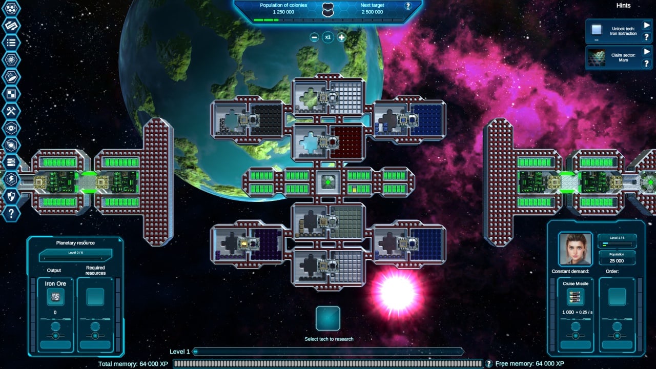 Прокачка осуществляется через Очки Апгрейда. Они нужны для открытия новых технологий в древе улучшений, насчитывающем 100 позиций и 200 этапов. Получая модернизации, пользователь достигает полной автоматизации процессов — от заготовки сырья до упаковки готовой продукции. Это освобождает время для управления другими колониями и орбитальными станциями.