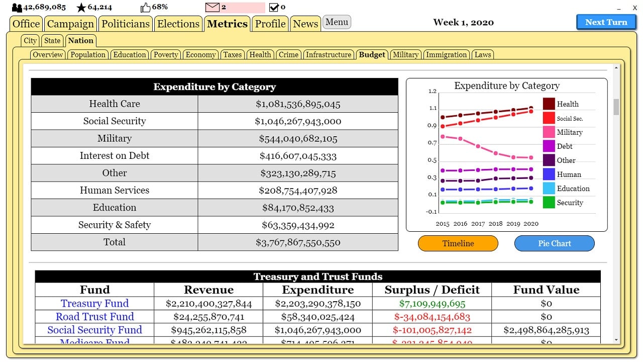 Исследуйте все 50 штатов Америки и около 3000 округов, где начнется ваша карьера. Каждый район уникален, а его жители представляют разнообразие взглядов на актуальные вопросы. Каждый штат имеет около 80 переменных: демографические характеристики, идеология, явка избирателей и уровень бедности.