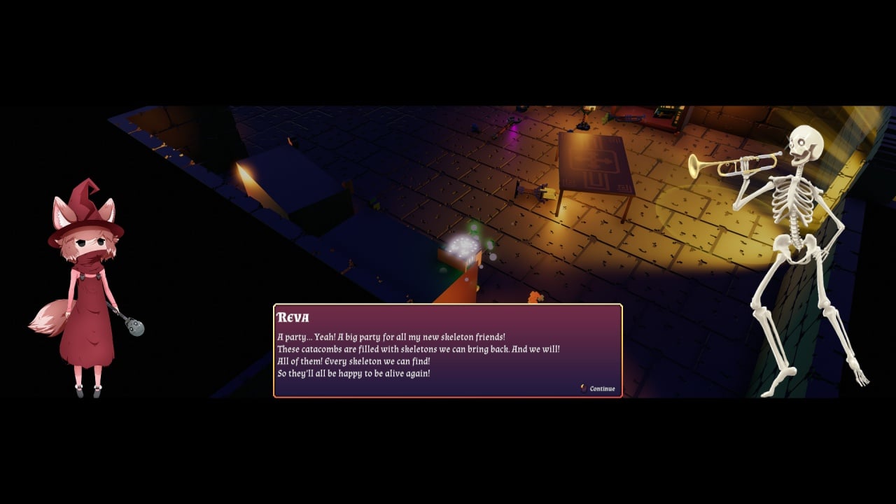 Skeletal Dance Party – ролевое экшен-приключение с элементами стратегии, где геймер берёт под контроль юную лисичку Риву. Её цель — устроить грандиозную вечеринку, пригласив всех друзей. Однако большинство её знакомых — это воскрешённые скелеты, орки и другие нежить. Место для праздника выбрано не случайно: Храм Праведного Света, полный монстров, готовых помешать веселью.