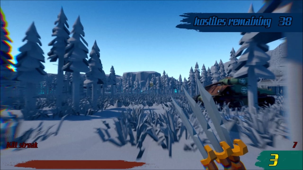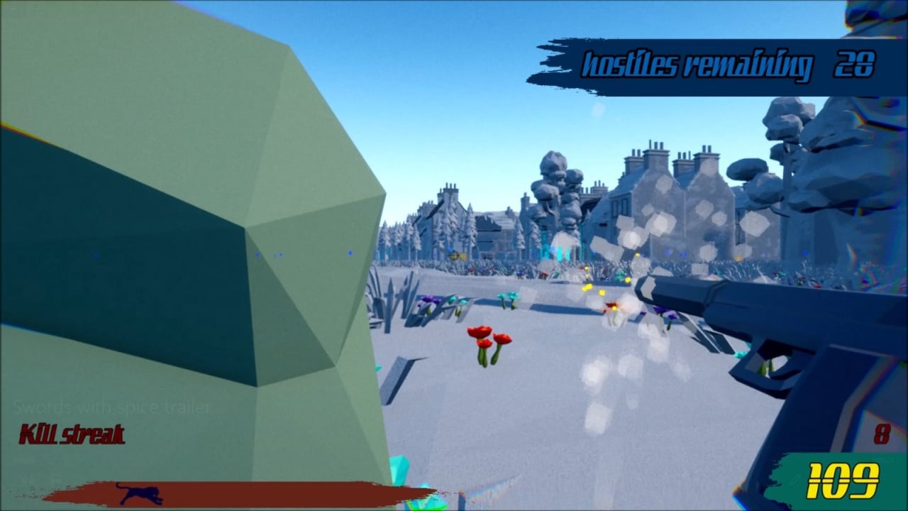Swords with spice – шутер от первого лица, где нет четкой цели, а главную ставку делают на динамичные перестрелки с необычными врагами: стеклянными существами, напоминающими людей. Бесконечное действие требует от геймера постоянного движения. Искусственный интеллект поражает точностью и ловко использует окружение, создавая сложные ситуации для пользователя. В правом верхнем углу отображается количество оставшихся врагов, стремящихся уничтожить протагониста. Уничтожив последнего оппонента, главный герой перемещается на новый уровень, где его ждут большее число противников и изменившийся ландшафт.