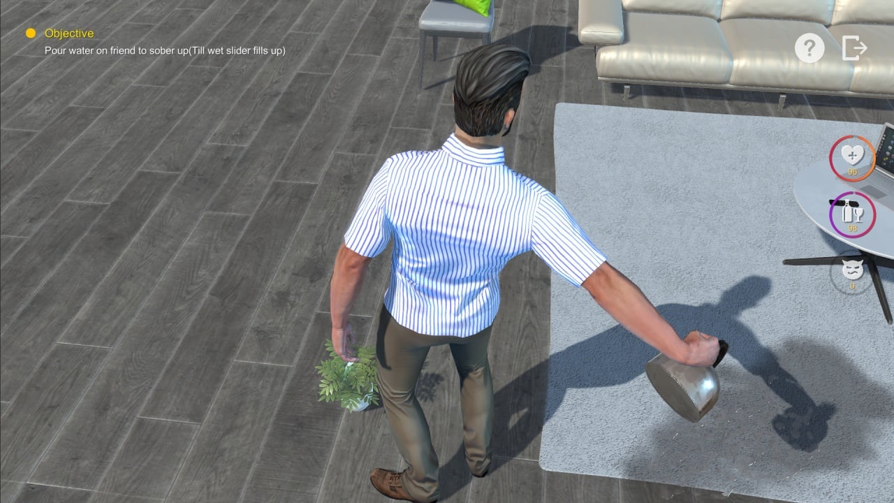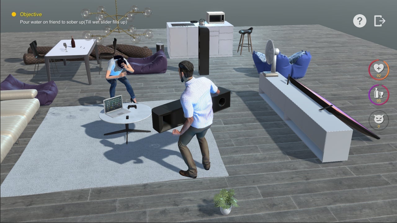 Благодаря искусственному интеллекту, геймер не сможет предсказать, что взбредёт в голову пьянице. Молниеносная реакция на изменившиеся условия – ключ к успешному прохождению однопользовательской кампании. С помощью детализированной моделизации объектов окружения, пользователь может взаимодействовать с любым предметом на локации, применяя их в различных ситуациях для развлечения или поиска правильного решения головоломки, связанной с успокаиванием любителей танцев под действием крепкого алкоголя.