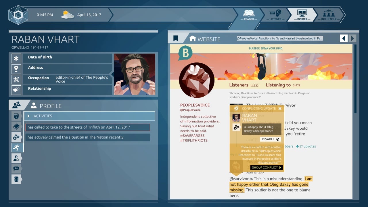 События происходят в секретном отделе Офиса — правительственной организации, занимающейся теневой политикой и контролем гражданских беспорядков, ведущих к политическому кризису между соседними странами. Подчиняясь указаниям Амплфорда, вам необходимо выработать давление на лидеров повстанческих групп и захватить медиаполе, распространяя свою версию "правды". Погружайтесь в жизнь Рабана Варта, редактора The People's Voice. Исследуйте его окружение, включая жену Карен и брата Илью. Раскройте их связи с напряженной ситуацией в стране.