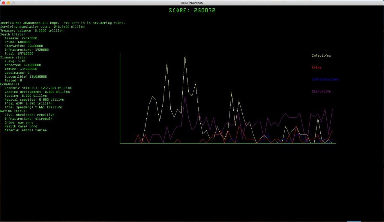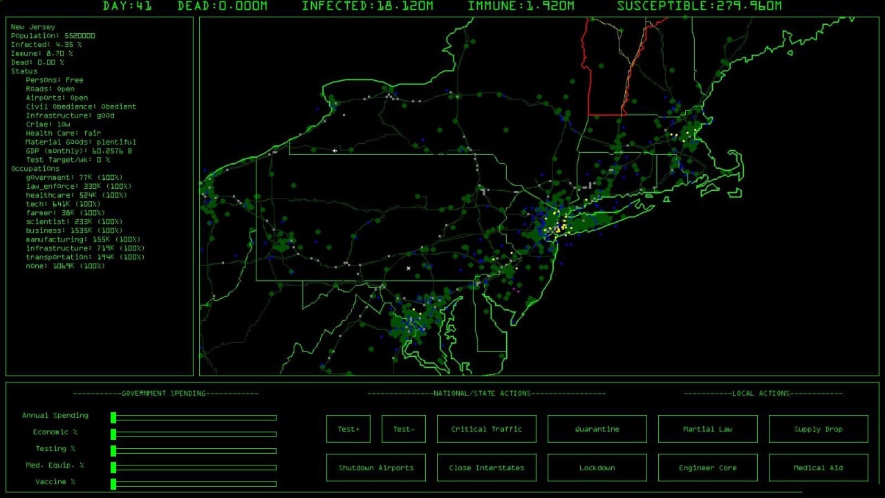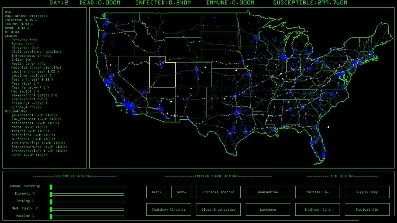 Это стратегический тайтл, который функционирует как симулятор действий американского правительства в условиях кризиса. Реализм игры впечатляет. Она правдоподобно воспроизводит распространение инфекции, учитывая плотность населения, логистику и экономические последствия.