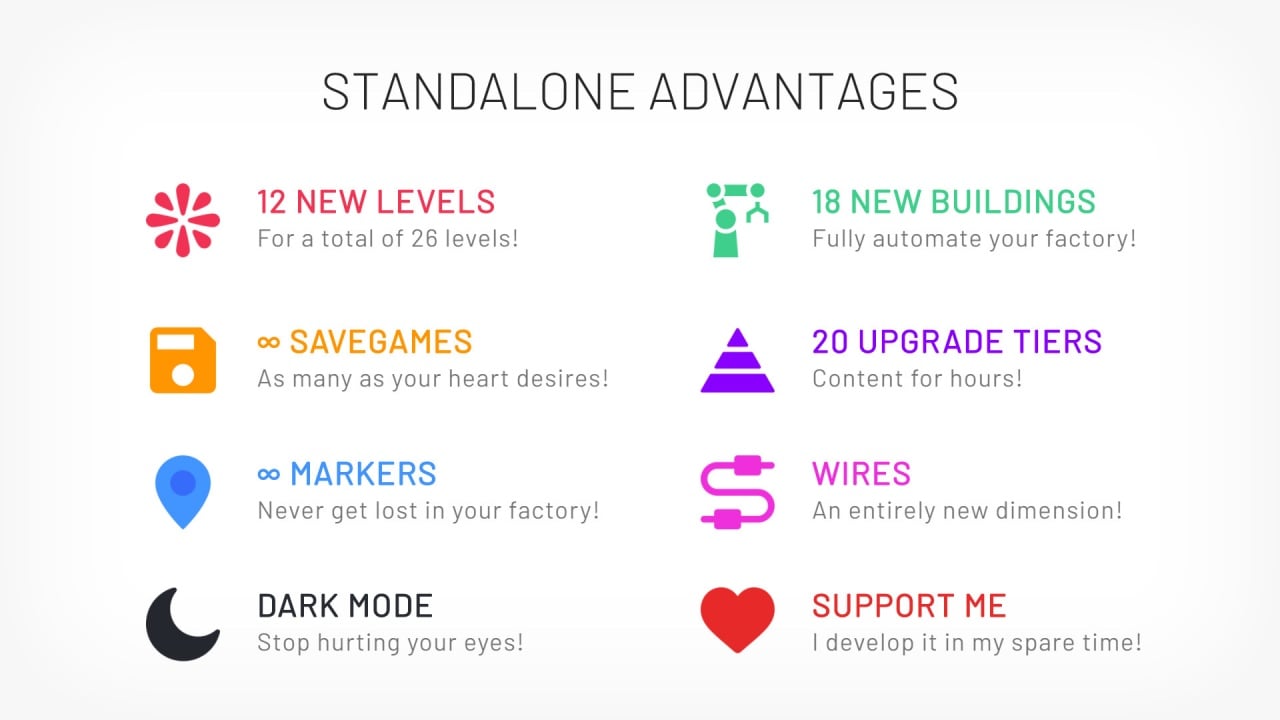 В игре доступен режим песочницы для бесконечных экспериментов на открытой карте, а также головоломки с 26 уровнями. Можно строить 18 типов зданий и использовать 20 апгрейдов. По мере прохождения открываются новые элементы и возможности, например, копирование схем расположения зданий для быстрого создания комплексов. Это заставляет перерабатывать завод и изменять пути. В этой стратегии-головоломке с видом сверху отсутствуют сюжет и финал. Проект поддерживает фанатские модификации.