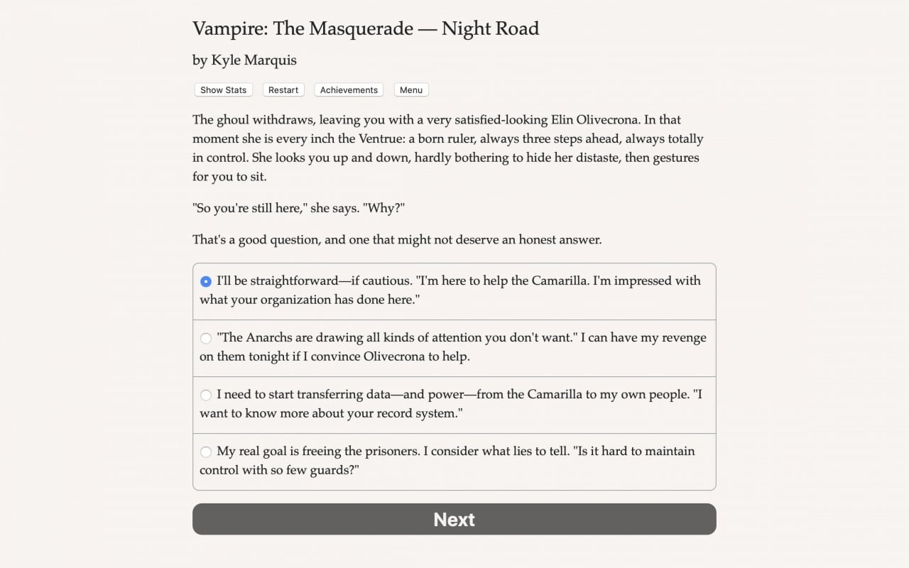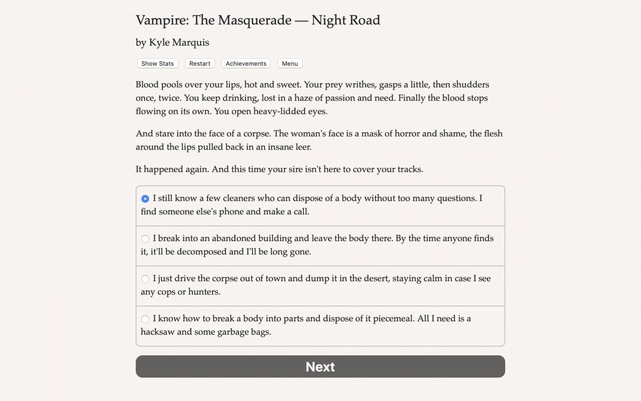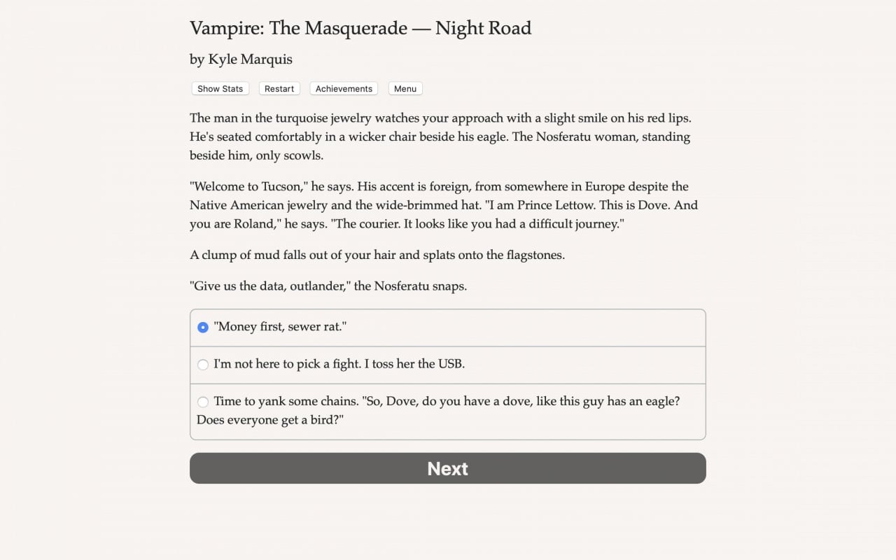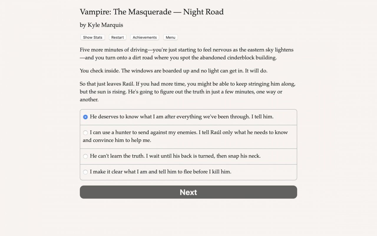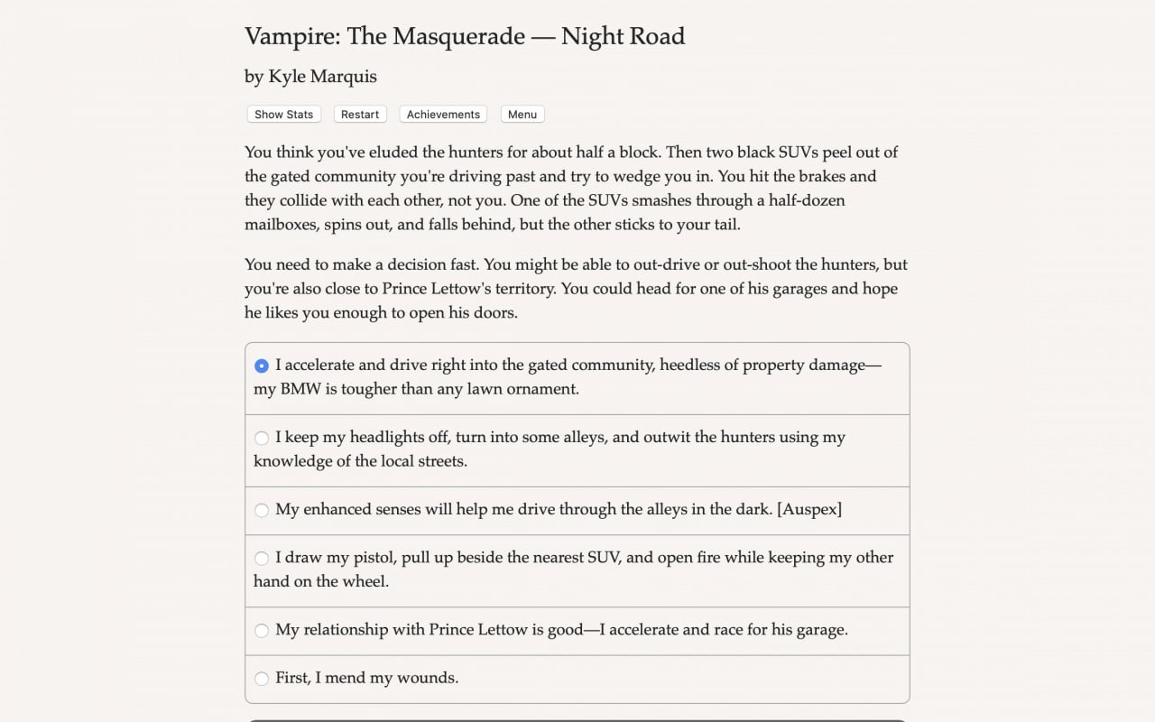 Vampire: The Masquerade - Night Road представляет собой текстовый тайтл, охватывающий 650000 слов. Здесь отсутствуют графика и звуковые эффекты, но присутствует нелинейный сюжет, генерация персонажа и система прокачки. Проект можно отнести как к RPG, так и к квестам, с множеством способов прохождения.