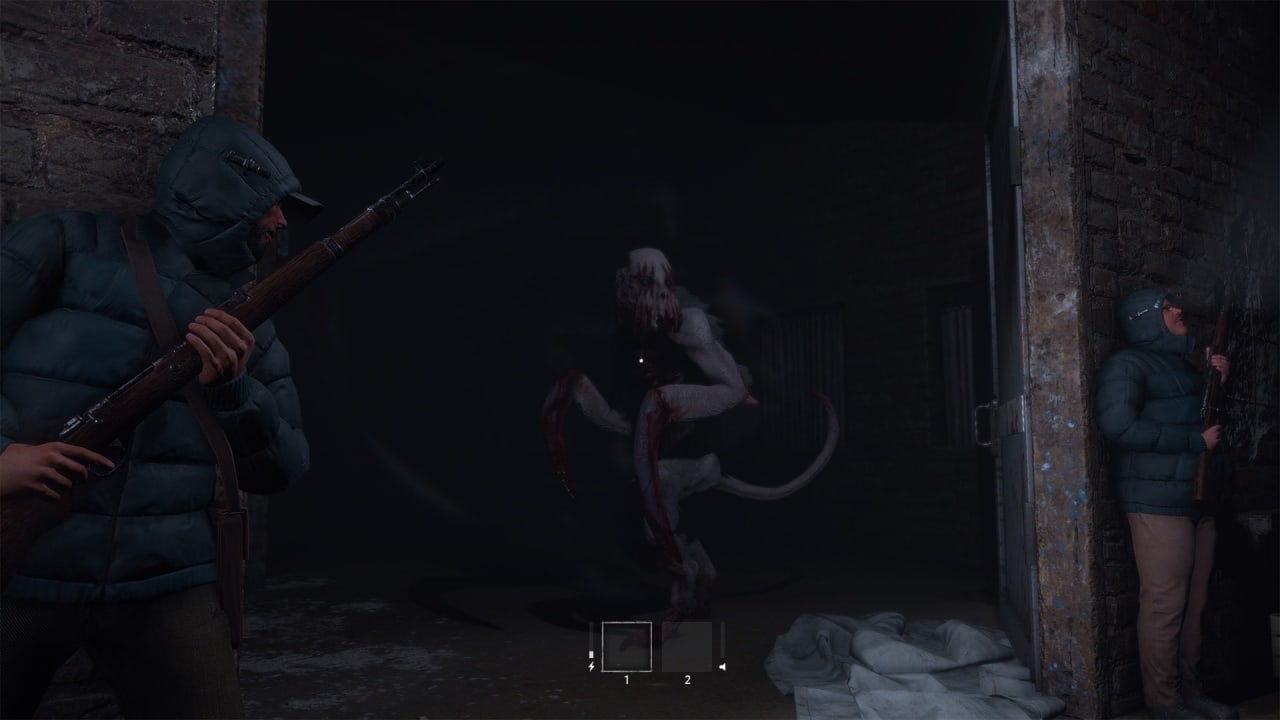 - используйте фонарик и флешбэнг, чтобы временно замедлить монстра, но будьте осторожны — яркий свет может парализовать и союзников;