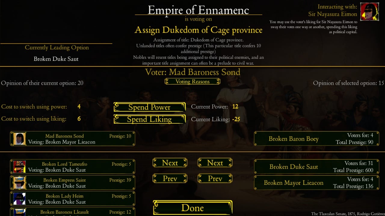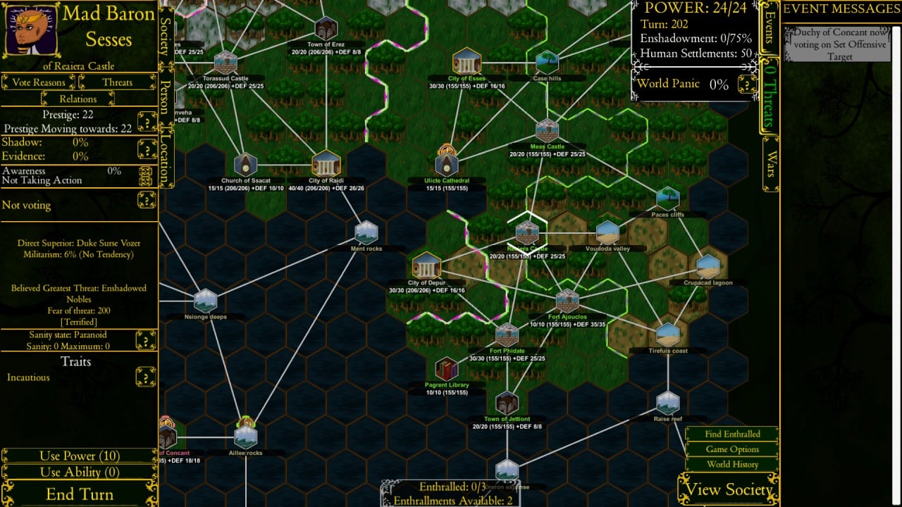 Игра предоставляет возможность манипулировать людьми и стравливать фракции. Можно заниматься пропагандой, подстрекать к бунту ремесленников или натравливать одно королевство на другое. Эти интриги разворачиваются на фоне напряжённой политической ситуации. Инди-проект радует проработанной симуляцией мира. Каждый благородный человек имеет вес в обществе и может голосовать на съездах. Голоса можно использовать в собственных интересах. Кроме того, можно создавать монстров, превращать приспешников в культистов, распространять болезни и даже провоцировать ледниковый период.